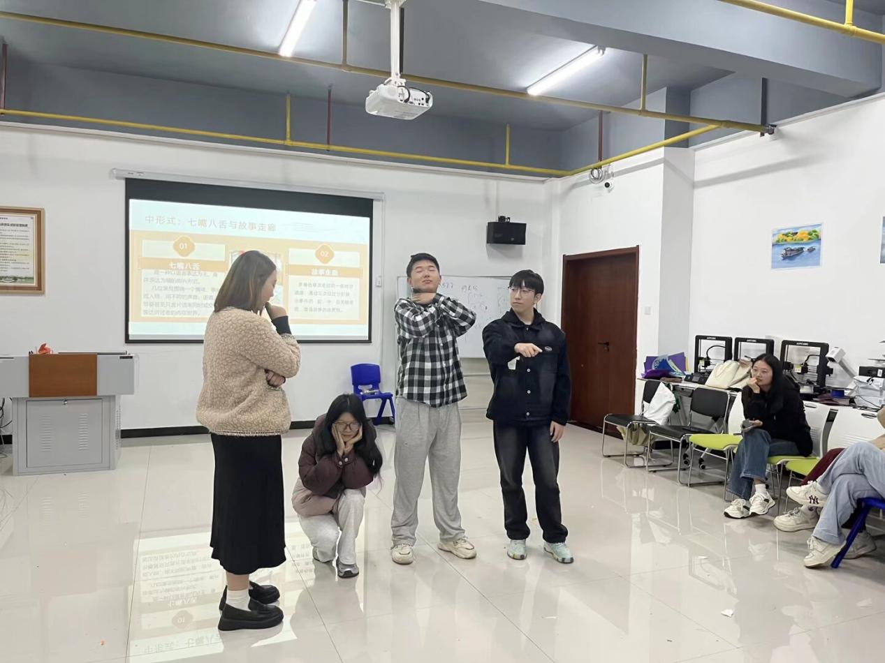 在课堂上,同学们轮流扮演“讲述者“”、“领航员”和“演员”。“讲述者”分享真实生活中的点滴感悟;“领航员”对讲述者提出一些问题,让大家对这个故事的领悟更深;而“演员”们则需迅速理解故事的情感内核,通过精准的肢体语言和简短对白将其呈现出来。张老师在一旁引导同学们如何更深层地捕捉故事中的情感线索,如何通过非评判性的表演,让分享者感受到被看见、被理解。这种教学形式打破了传统课堂的单向传授,大家成了彼此的倾听者和支持者。在共同创造故事场景的过程中,班级的凝聚力和信任感显著增强了。这种体验式学习不仅让同学们掌握了一项实用的心理辅导技术,更是一次深刻的自我觉察和人际连接的过程。