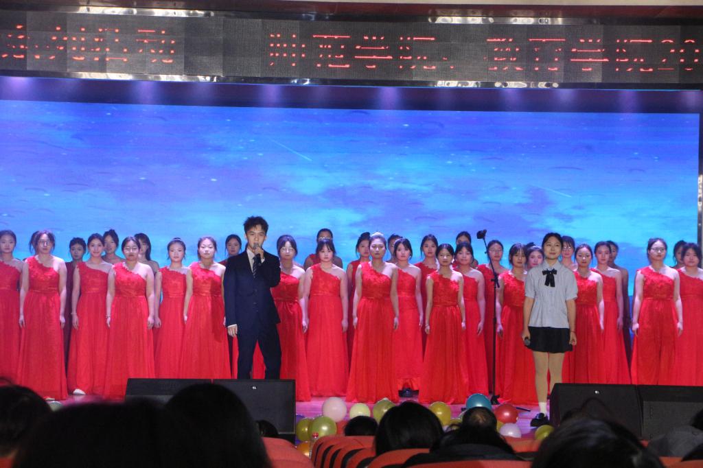 晚会高潮迭起,学生党支部学生党员与24级青马班成员联袂登台,合唱《走向复兴,我会等》。他们身着统一服装,身姿挺拔、精神抖擞,眼神中满含对家国的赤诚与对未来的憧憬。他们以铿锵有力的节奏、慷慨激昂的歌声传递青春力量,将晚会氛围推向高潮,展现出学院学子昂扬向上的精神风貌。