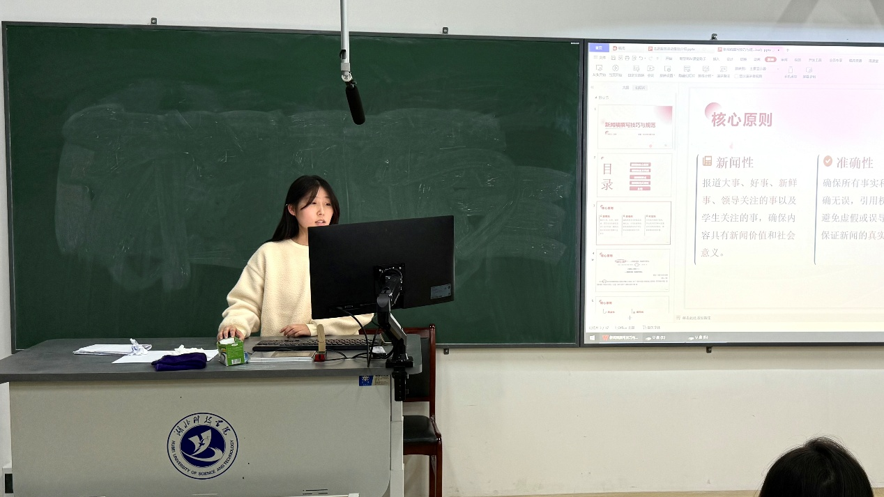 培训伊始,汪卓围绕“新闻稿撰写技巧与规范”展开详细讲解。她结合自身撰写经验,明确新闻稿的三大核心原则——新闻性、准确性和时效性,强调新闻稿需立足事实、突出重点,确保信息传递的及时与精准。随后,汪卓从新闻稿的基本构成入手,拆解标题、导语、主体、结尾等关键模块的撰写要点,针对标题的吸引力、导语的概括性、主体的逻辑性以及结尾的总结性进行逐一分析。同时,她详细解读新闻稿的格式规范,包括字体、行距、落款等细节要求,通过实例对比,让各位同学们直观了解规范撰写与不规范撰写的差异。讲解尾声,汪卓对本次内容进行总结,鼓励学员在实践中灵活运用技巧,提升新闻稿质量。