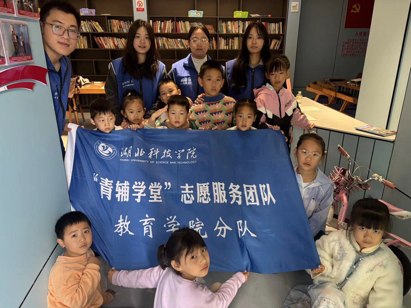 图为小朋友们与志愿者的活动合照