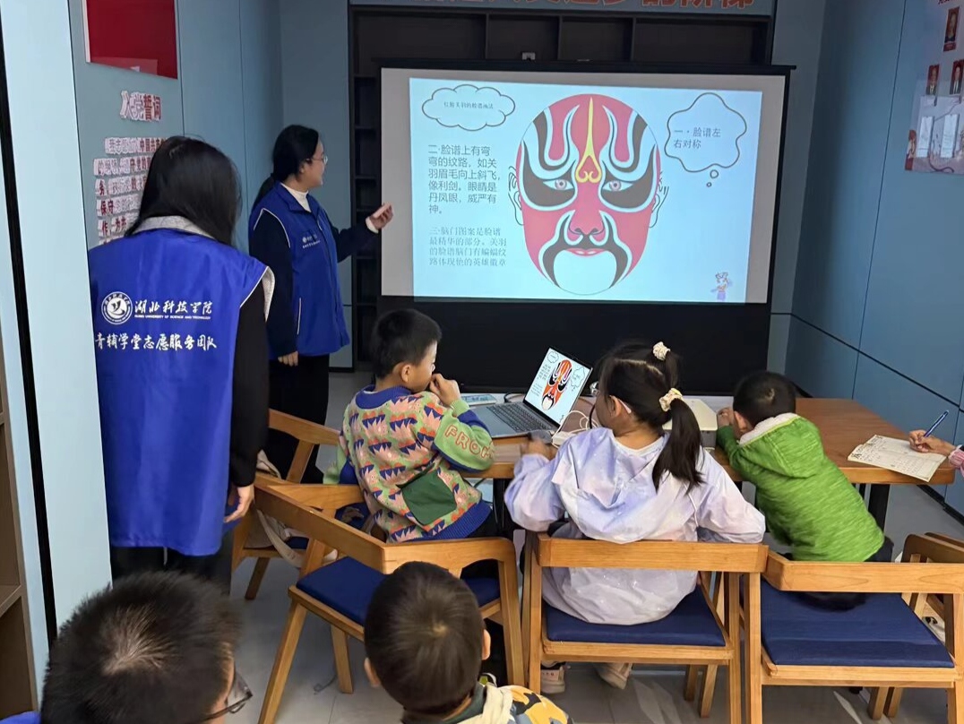 图为志愿者为小朋友们讲解脸谱的奥秘