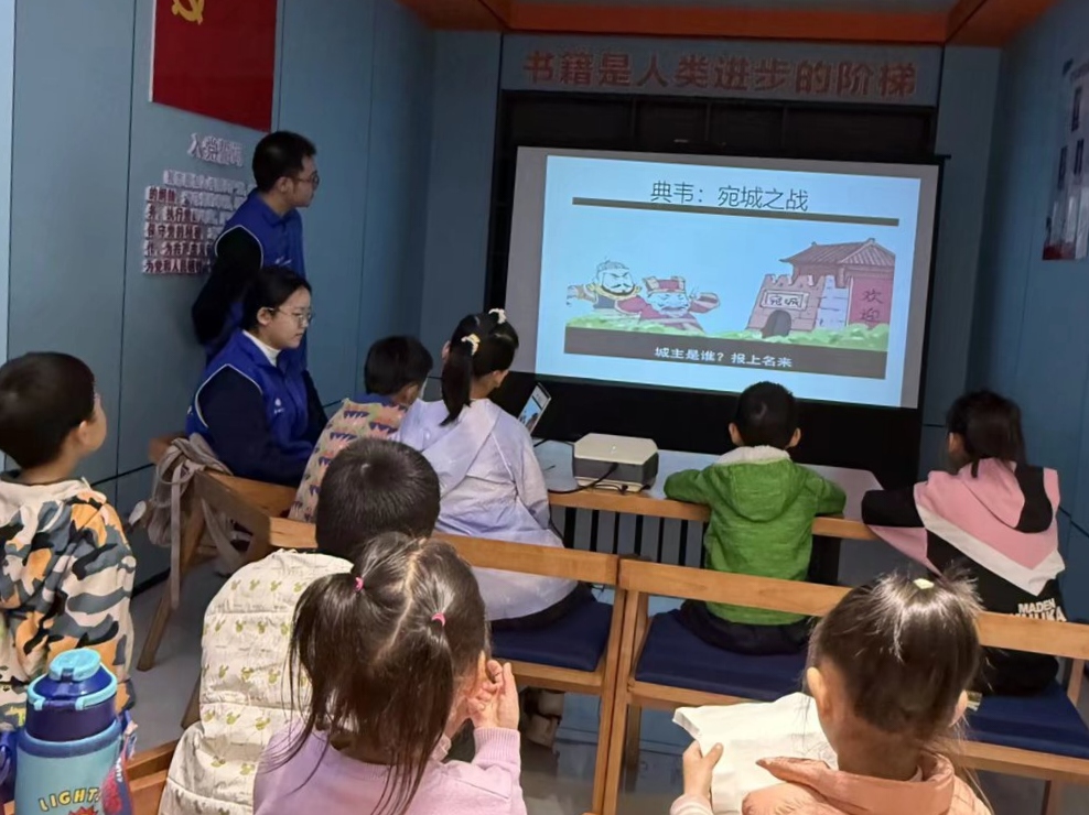 图为志愿者为小朋友们播放视频