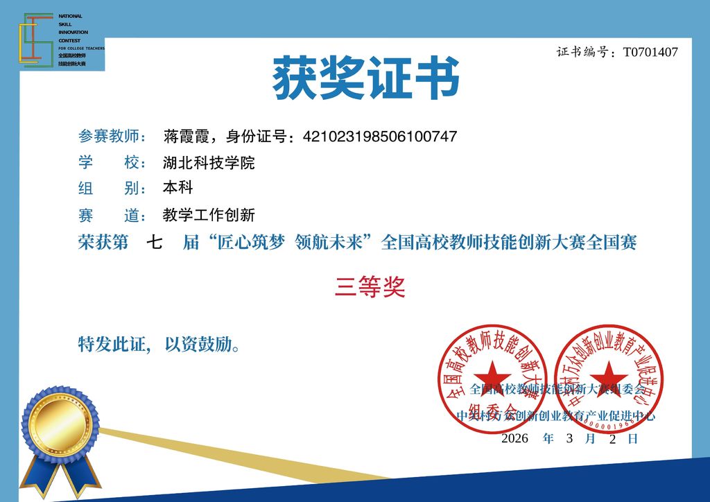 (撰稿:蒋霞霞 审核:俞佳君)2026年3月2日,第七届"匠心筑梦 领航未来"全国高校教师技能创新大赛圆满落幕。我院应用心理学专业蒋霞霞、张碧云两位教师凭借扎实的教学功底与创新的教学实践,从全国904所高校4014名参赛教师中脱颖而出,双双荣获全国三等奖,充分展现了我院教师在教育教学改革中的创新活力与专业素养。