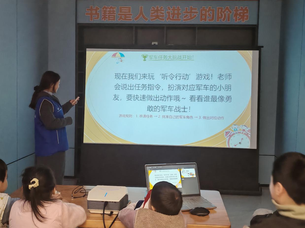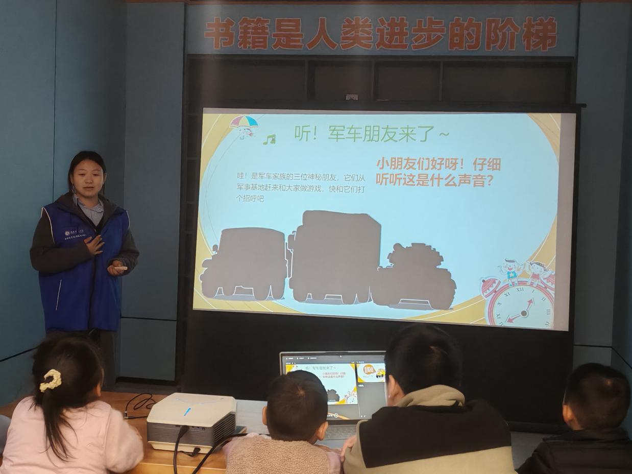 活动伊始,志愿者以“军车基地开放日”为情境主线,通过播放军车轰鸣声吸引小朋友们的注意力,并结合拟人化PPT课件,详细介绍了吉普车、运输卡车、装甲车的外形特征与功能,生动的讲解让小朋友们对三种军车形成了清晰认知。