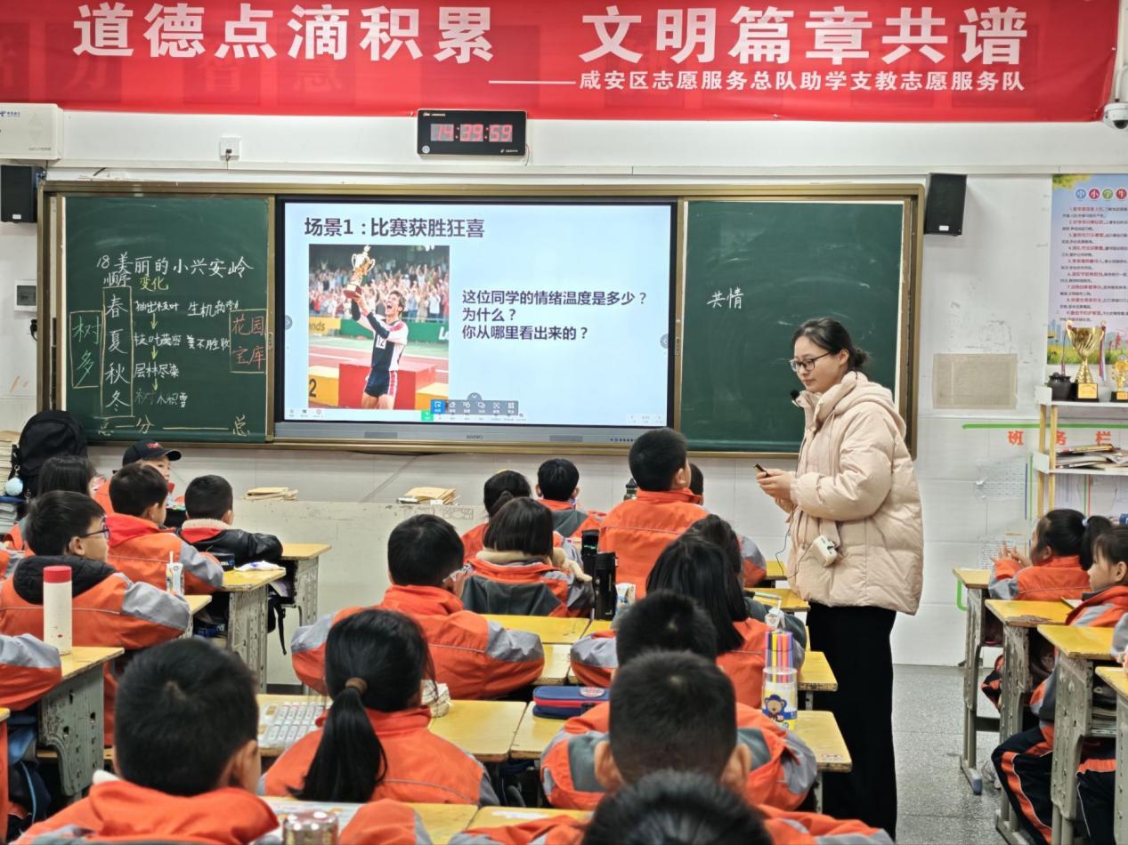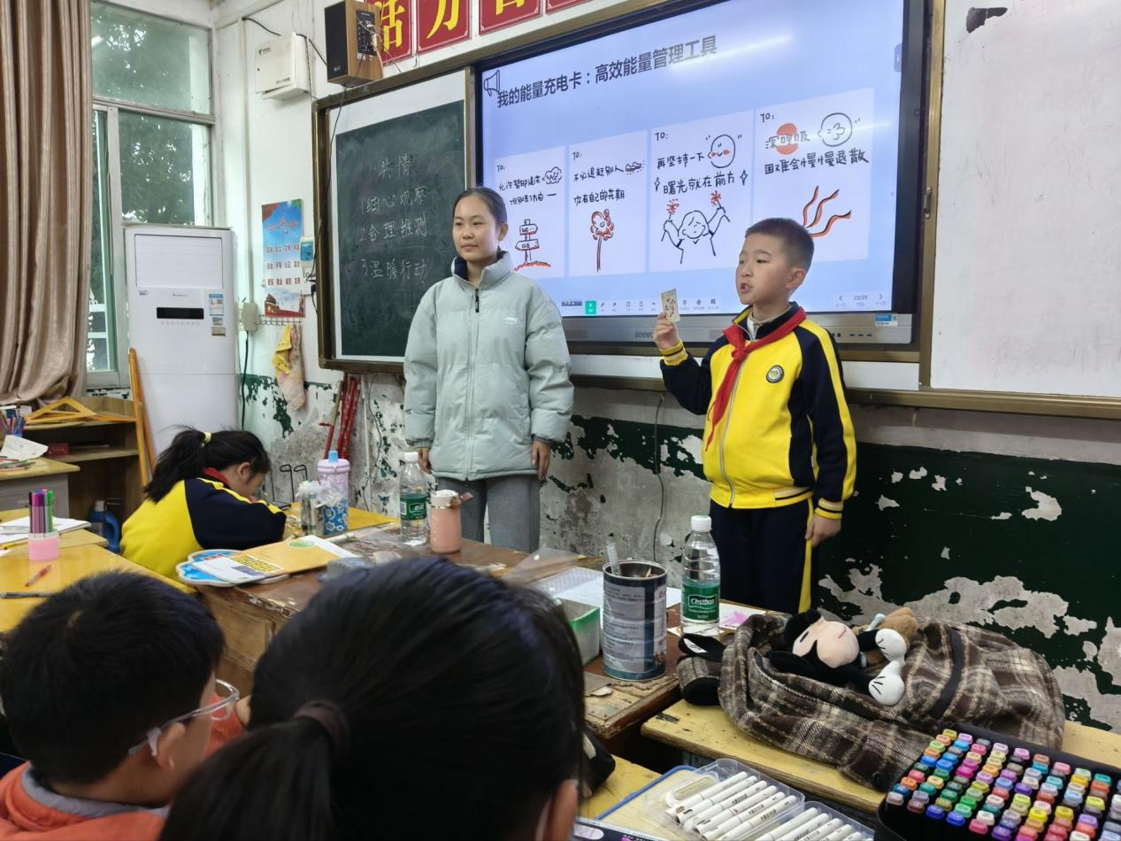 活动分阶段稳步推进,思政育人成效显著。前两周的“阅读与情绪认知”阶段,志愿者带领孩子们共读《我的情绪小怪兽》《伤心黑洞,开心火箭》等优质绘本,通过“情绪猜猜看”角色扮演、“我的情绪晴雨表”制作、“如果我是TA”情景讨论等趣味形式,引导孩子们学会科学识别情绪、勇敢合理表达,在互动中涵养同理心与包容心,筑牢健康心理与和谐人际的思政基础,建立起师生间、同伴间的信任联结。第3-4周聚焦“阅读与自我成长”,以刘胡兰、小萝卜头、王二小等革命先烈和时代楷模的红色故事为生动教材,点燃孩子们的榜样力量,与爱国热情,厚植红色基因;“我的优点树”绘画活动,引导孩子们发现自身闪光点,树立自信自强的人生态度;“借东西被拒绝”“游戏起冲突”等情景剧的角色互换演练,让孩子们在实践中掌握非暴力沟通等人际相处技巧,涵养文明素养与责任意识。第5周的“阅读与压力管理”环节,通过“压力气球”趣味游戏导入,引导孩子们绘制“压力分析图”,将无形压力可视化,学会科学释放情绪的方法,筑牢心理健康防线。最后一周的“阅读与方法升华”,志愿者系统传授摘抄、思维导图等读书笔记技巧,助力孩子们从“爱读”进阶到“会读”,培养终身学习能力,为传承中华优秀传统文化、汲取红色精神养分奠定坚实基础。
