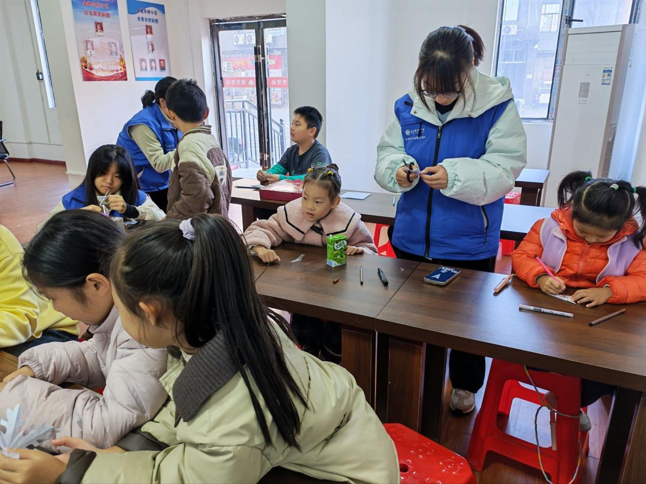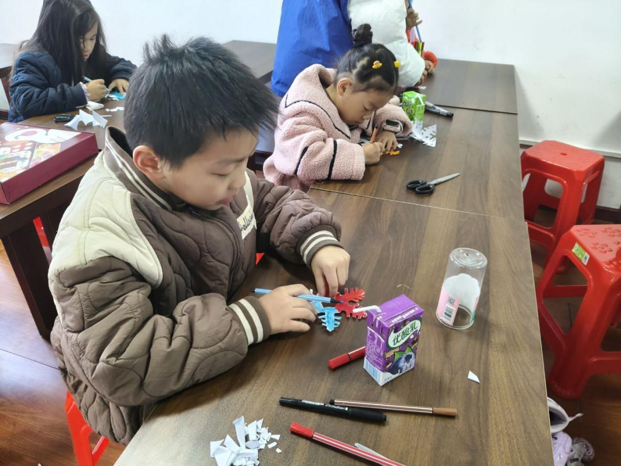活动的高潮部分是手工制作环节。志愿者们为小朋友们准备了丰富的手工材料,鼓励他们发挥想象力和创造力,用白纸、彩笔、剪刀制作六角雪花。孩子们迫不及待地动手操作,有的小心翼翼折叠纸张,有的专注地裁剪花纹,遇到困难时主动向志愿者和同伴求助。在大家的巧手下,一片片造型独特的雪花应运而生,有的点缀着精致的镂空花纹,有的搭配了可爱的卡通元素。作品展示时,孩子们踊跃分享自己的创作想法,志愿者们给予每个人积极的鼓励与赞扬,教室里洋溢着满满的成就感与幸福感。在手工活动中,小朋友们动手动脑,不仅锻炼了动手能力和手眼协调能力,还激发了创造力和想象力。