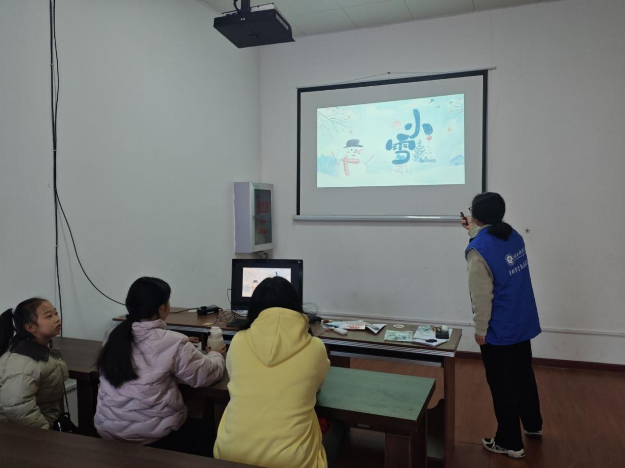 在“解密小雪”环节,志愿者们用亲切的话语和形象的动作科普知识。通过观看视频与互动问答,小朋友们对小雪的时间和由来有了清晰的认识。志愿者们借助生动的例子和巧妙的比喻,为小朋友讲解小雪的物候特征,纠正了“小雪必下雪”的认知误区。随后,志愿者们带领小朋友们一起识记“小雪三候”,加深对小雪节气规律变化的认识与了解,进一步感受中国传统节气文化的魅力。