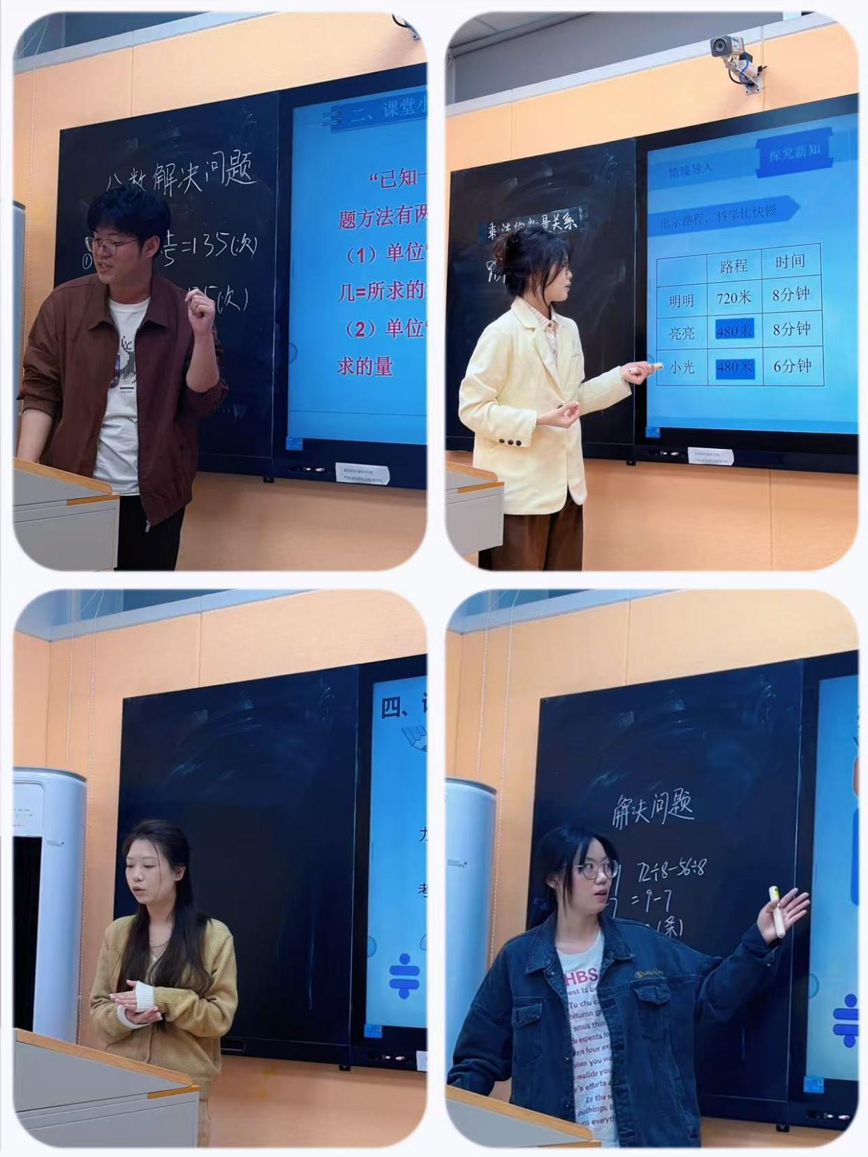实战展风采,研练强技能。本次实训以说课 + 无生试讲为主要形式,围绕 《倍的认识》《乘法的数量关系》《两种思路解决问题》《分数解决问题》四个小学典型课例展开。在章普老师的统一组织下,研究生以两人小组合作展示,一人聚焦教材解读、目标设定、流程设计进行规范说课,一人模拟真实课堂开展完整试讲。同学们准备充分、教态大方、逻辑清晰,能够结合学段特点设计教学活动,展现出良好的专业素养与课堂表现力。
