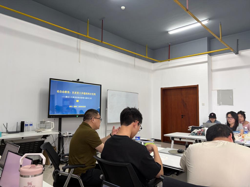 袁尚会书记以自由教育的传承与转型为题,开展亚里士多德与弗吉里奥教育思想研读分享。他追溯自由教育从古典到近代的发展脉络,对比亚里士多德“理性与德性统一”的古典自由教育范式,与弗吉里奥“以人为本、身心和谐”的近代人文主义教育重构,厘清自由教育“为了人的自由与完善”的精神内核。汇报直面当下人文教育功利化、工具化的现实困境,提出回归非功利初心、融合科技与人文、培育完整人格的破局之道,彰显自由教育在 AI 时代的独特价值与文明传承意义。