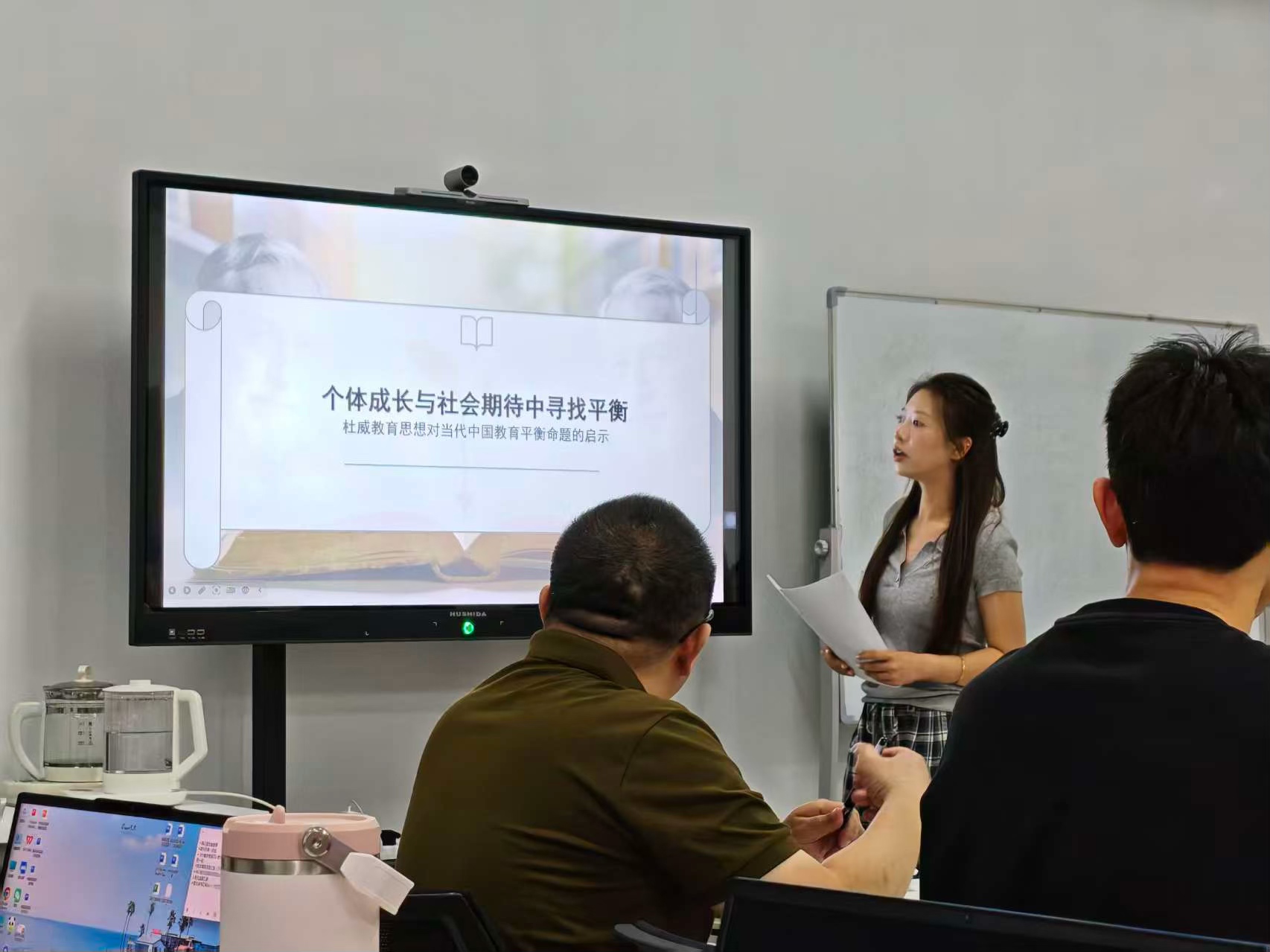 报告会上,姚鑫玥同学以杜威教育思想为核心进行学术分享。她以“个体成长与社会期待中寻找平衡”为主题,系统阐释了杜威实用主义教育哲学,深入解读 “教育即生活”“学校即社会”“做中学”等核心观点,批判传统灌输式教育的局限,强调教育应以儿童为中心、在实践中实现经验的不断改造与生长。汇报立足当代中国教育现实,聚焦个体主体性与社会协调性的平衡命题,深刻揭示杜威思想对破解教育功利化、回归“育人”本质的重要启示,为新时代教育如何兼顾当下需求与长远成长提供了全新思考视角。