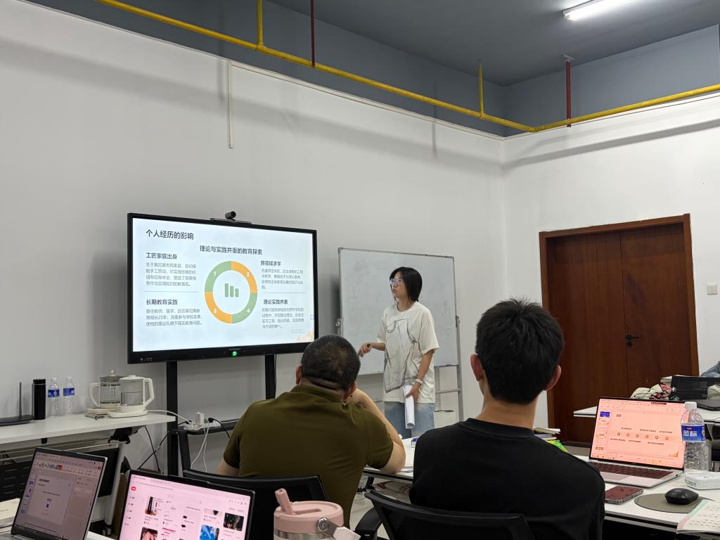 紧接着,聂淋同学带来凯兴斯泰纳教育思想专题解读。她以19世纪末德国工业化社会转型为背景,剖析凯兴斯泰纳“劳作学校”思想的源起与内核,阐明教育以培养“有用公民”为根本使命,通过职业陶冶、性格陶冶、公民陶冶三重递进路径,实现技能训练、品德养成与国家认同的有机统一。汇报对比中西劳动教育思想差异,结合我国立德树人根本任务,提出劳作教育对推动普职融通、强化劳动育人、培育现代公民精神的实践价值,为新时代劳动教育体系构建提供了理论参考。