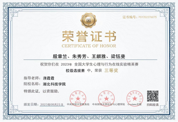 殷章竺、朱秀芳、王麒雅、梁钰斐:2023年全国大学生心理与行为在线实验精英赛校级选拔赛三等奖