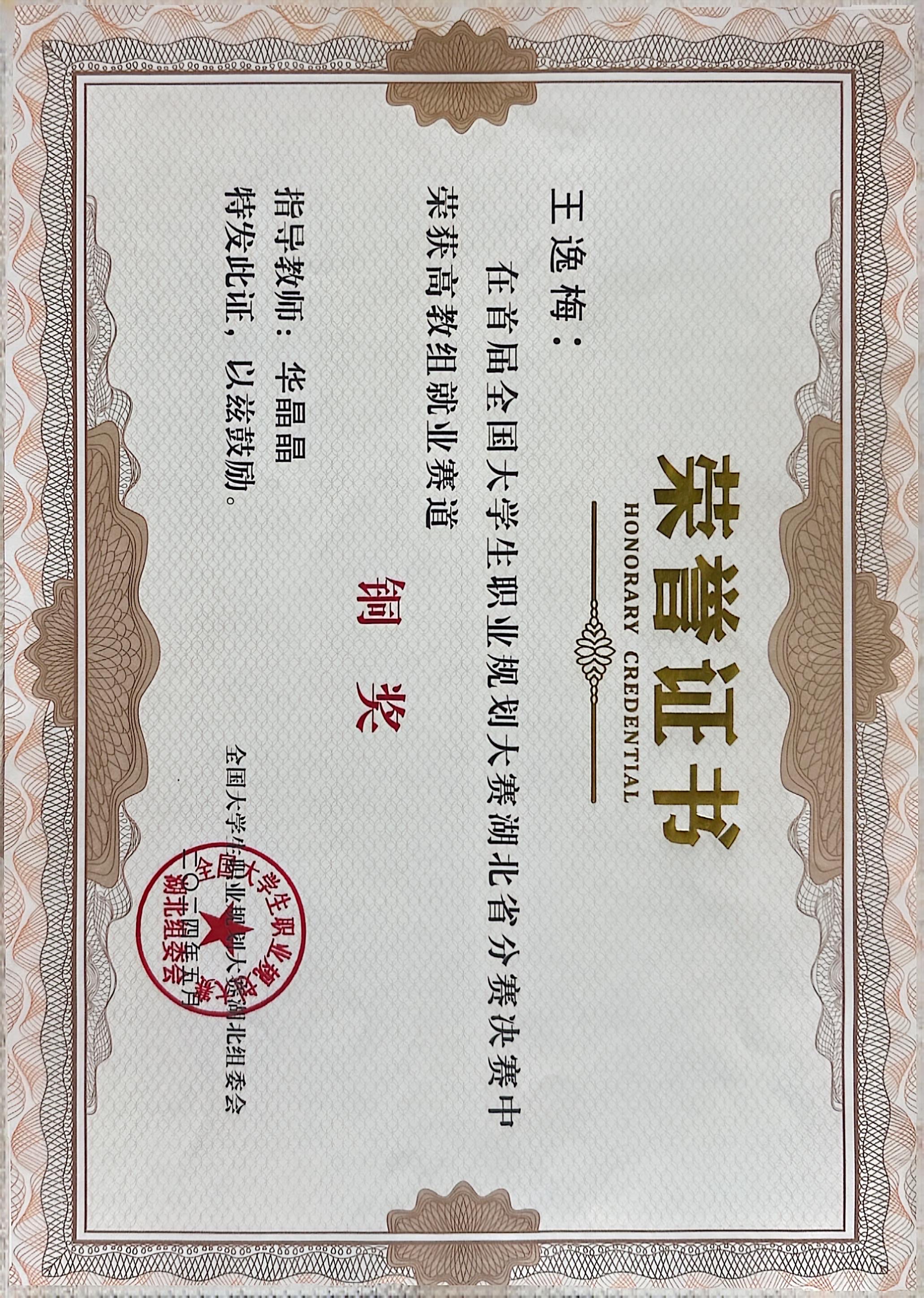 王逸梅:全国首届大学生职业规划大赛湖北省分赛决赛高教组就业赛道铜奖