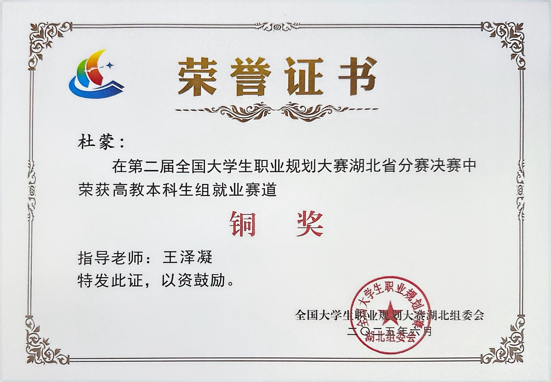 杜蒙:第二届全国大学生职业规划大赛湖北省分赛决赛高教本科生组就业赛道铜奖